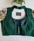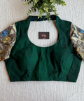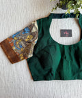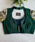 Green high pot neck padded, pen kalamakri sleeves with zari border on sleeves end and potli back open blouse