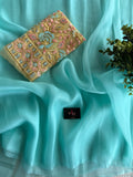 Take bold risks with our Lt yellow blouse and Lt Blue jute organza saree! The blouse features stunning sequin embroidery, while the saree is made of lightweight yet durable jute organza. Step into the world of adventure and challenge with this unique ensemble.
