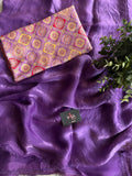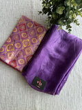 Transform any occasion into a glamorous affair with our purple shiny tissue organza saree. Made from luxurious organza fabric, this saree will enhance your feminine silhouette and make you feel like a true diva. Complete with a matching blouse, it is perfect for any sophisticated and exclusive event.