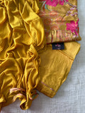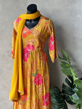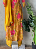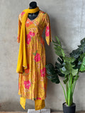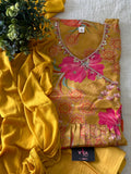 Angrakha cut neck embroidery Chinnon silk ready kurti, plain satin silk pant comes with plain chiffon dupatta