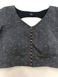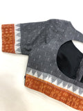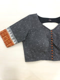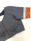 Round neck Grey with orange n white border ikat blouse with Orange potli button at front
