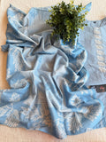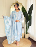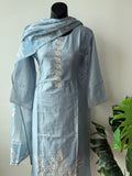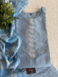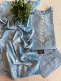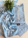 Light Blue printed silk cotton top, plain silk cotton bottom comes with printed dupatta