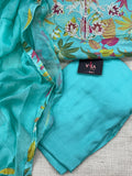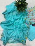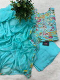Neck Bead embroidery work printed muslin kurta top, elastic waist plain santoon pant comes with plain chiffon dupatta with attached border