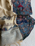 Kalamkari printed top, elsatic waist printed cotton bottom comes with applique work and printed raw silk dupatta