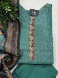 Round neck kalamkari patch printed muslin kurti, Elastic wasit ready pant coems with knot work kalamkari printed chanderi cotton dupatta