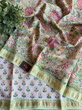 Hand Block Printed Pure Chanderi saree comes with golden zari maheswari border with printed pallu and running blouse pc