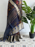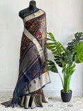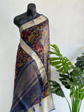 Kalamkari printed pure organza saree comes with antique Kanjeevaram zari border, with tassels on pallu, with plain blouse pc