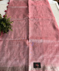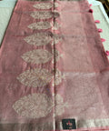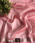 The silver zari tissue saree is crafted with intricate weaving and showcases an embroidered pallu, accompanied by a matching blouse piece for an elegant ensemble.